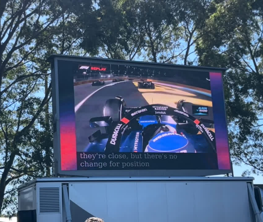The screen is split into two parts. On the left, a yellow background with black text as the title reads, “2024 Formula 1® Australian Grand Prix.” Below that, in a pink box with black text, it reads, “Key Features included: The introduction of closed captioning on all screens at the FORMULA 1 ROLEX AUSTRALIAN GRAND PRIX 2024.” On the right, two short videos show closed captioning on screens across Formula 1® Australian Grand Prix.